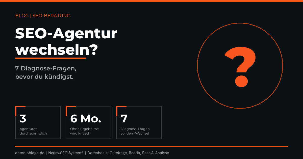 Kernfazit: Bevor du deine SEO-Agentur kündigst, arbeite die 7 Diagnose-Fragen durch. Die Entscheidung zwischen Weitermachen, Wechseln und Freelancer wird damit sachlich statt emotional – und du vermeidest den teuersten Fehler: dieselben Probleme bei der nächsten Agentur wieder zu haben.